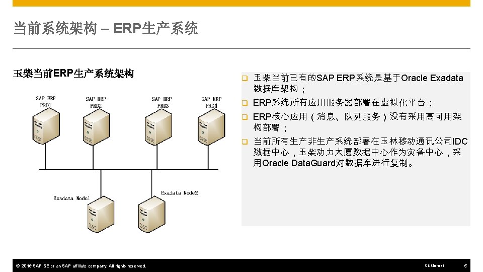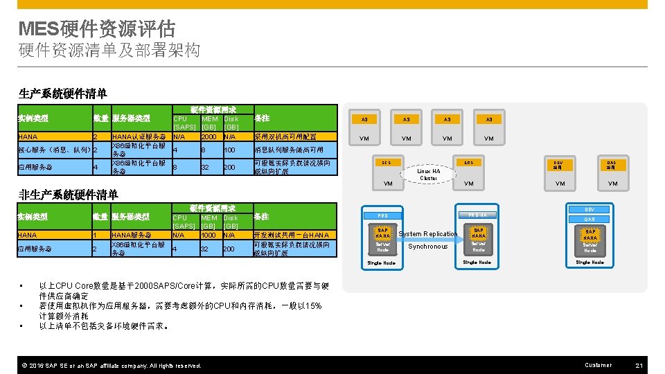 硬件部署架构 ~10 KM 玉林移动通讯公司IDC 非生产环境 ERP DEV 应用 玉柴动力大厦 生产环境 ERP QAS 应用 ERP DI 10 Gbps SAN 生产环境 ERP 核心服务 CRM核心服务 CRM 核心服务 System Replication ERP DI Virtualization CRM DEV 应用 CRM QAS 应用 SRM DEV 应用 SRM QAS 应用 MES DEV 应用 MES QAS 应用 EWM DEV 应用 EWM QAS 应用 CRM DI SRM DI MES DI CRM DI SRM 核心服务 MES 核心服务 EWM 核心服务 Web. Dispatcher EWM DI ERP HANA DEV/QAS MES HANA DEV/QAS VM Hypervisor B CRM HANA DEV/QAS SRM HANA DEV/QAS EWM HANA DEV/QAS 非生产环境HANA MES DI EWM DI NFS Server VM Hypervisor A SRM DI NFS Server VM Hypervisor C ERP PRD HANA (P) ERP PRD HANA (s) CRM PRD HANA (P) CRM PRD HANA (s) SRM PRD HANA (P) SRM PRD HANA (s) MES PRD HANA (P) MES PRD HANA (s) EWM PRD HANA (P) EWM PRD HANA (s) Enterprise Storage A Enterprise Storage B 生产环境HANA © 2016 SAP SE or an SAP affiliate company. All rights reserved. Customer 47