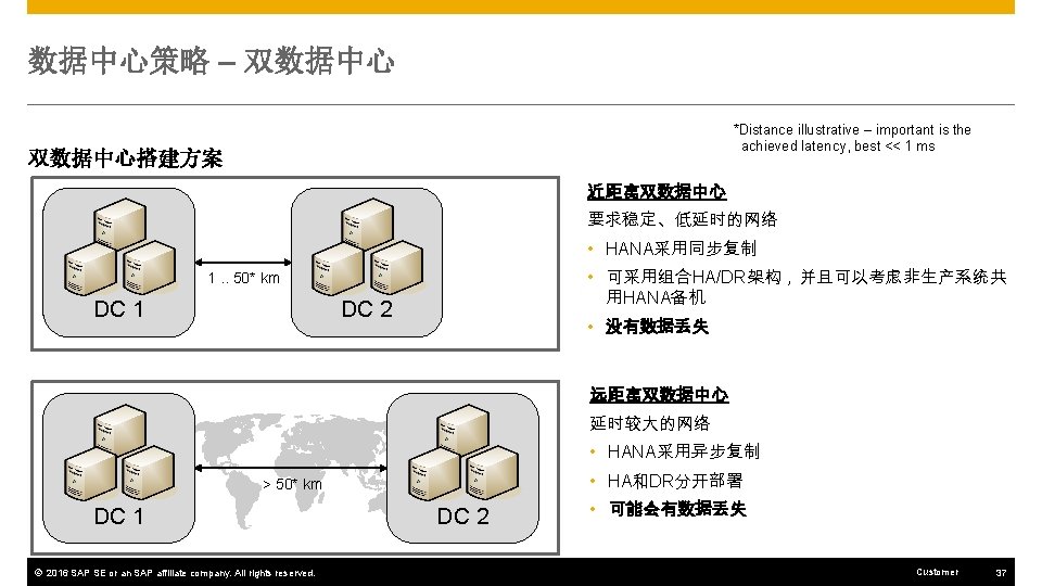 SAP HANA HA & DR 方案选项 选项 2: 利用System Replication实现高可用/灾备组合 System Replication for combined HA/DR HA or DR? RTO Same technical solution for HA and DR over limited distances. Synchronous mode required for HA. Technical corruption protection (block corruption on storage level). Hardware of standby database could theoretically be reused for non-production systems (pre-load off), but: For fast failover (HA), the data must be preloaded on the secondary node(s). DC 1 DC 2 SAP HANA Sync System Replication PRD log data HA and local DR Data loss (RPO) Very fast None DCs / Network HANA nodes Metro distances Low NW latency (~ up to 1 ms) 2 * N SAP HANA PRD HA/DR log data Low latency © 2016 SAP SE or an SAP affiliate company. All rights reserved. Customer 40