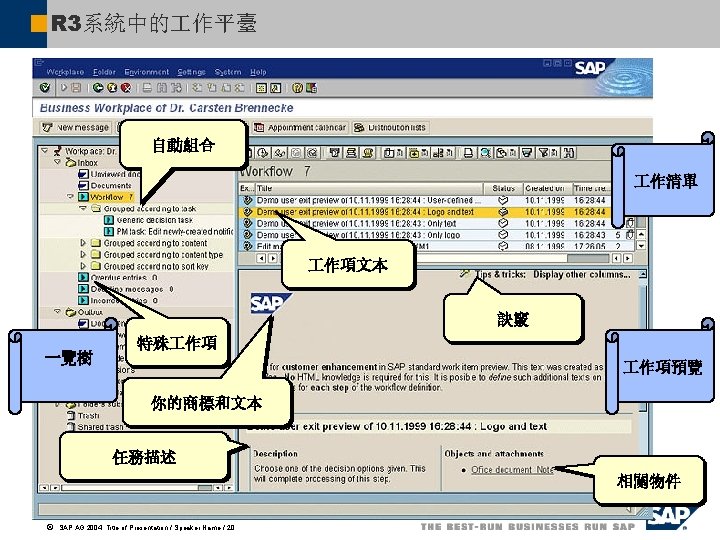 作平臺 – 作清單(1) 保留 顯示附件 執行 替代 創建附件 ã SAP AG 2004, Title of Presentation / Speaker Name / 21