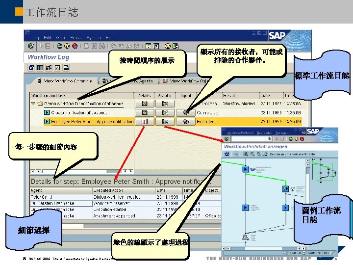 圖形 作流日誌 Status Agent Route (green path) ã SAP AG 2004, Title of Presentation / Speaker Name / 49