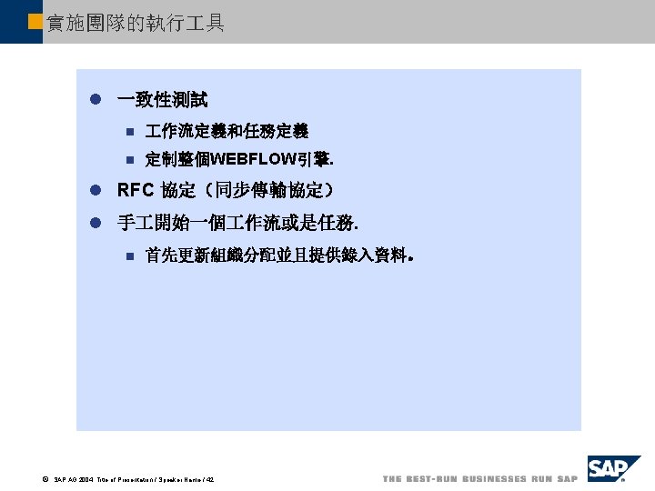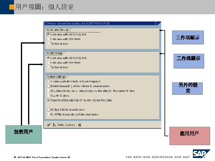 作平臺上的 作流寄件匣 作平臺 收件箱 寄件匣 開始的 作流 Flow item for WS 30000015 Flow item for WS 30000161 Flow item for WS 99900035 被執行的 作流 Work item 1 for TS 7869 Work item 2 for TS 7869 Work item 3 for TS 7869 發出的 作流 Work item 1 for TS 99900062 ã SAP AG 2004, Title of Presentation / Speaker Name / 43 作平臺的寄件匣提供給 用戶一個可以他在 作流過程 中處理的 作一覽表.