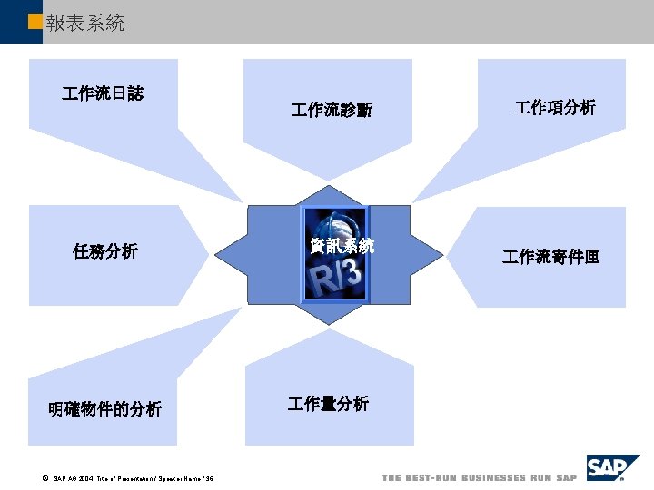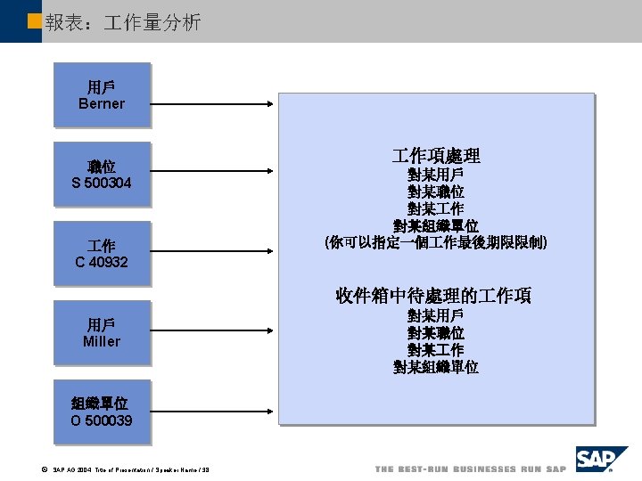 報表: 作項分析 Work Items …. Monitoring period Today Last 7 days Last 30 days Last 365 days Time Interval on from Work item type Dialog (Sub) Workflow Background Task filter Task group (T) Task group (TG) Application component ã SAP AG 2004, Title of Presentation / Speaker Name / 37 to l 每個任務的 作項 (f頻 率) l 處理期間的 作項 l 監控最後期限的 作項