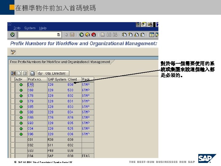配置作業總覽 Activity Automatic Always required? Default entry used Maintain an active plan version 01 Check entries from the HR control table Maintain prefix numbers Check number ranges Configure RFC Destination User WF-BATCH Maintain a system administrator for workflow SY-UNAME Generally classify decision tasks [W 1]Your own user ID Maintain a standard domain for Internet mail Activate sending to objects and HR objects Maintain demo and verification environment Schedule background job for missed deadline Schedule background job for work items with errors Schedule background job for condition evaluation Schedule background job for event queue Schedule background job for clearing report ã SAP AG 2004, Title of Presentation / Speaker Name / 54