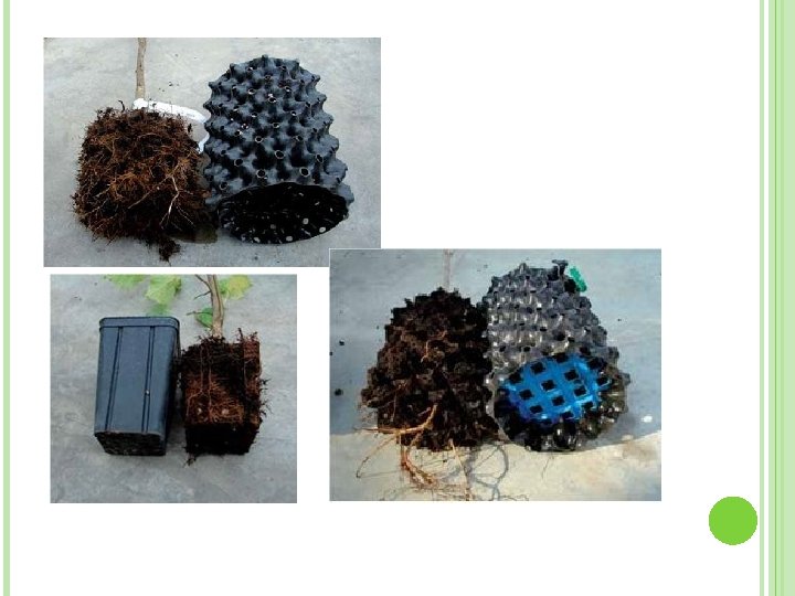 LAVORAZIONI DELLE RADICI IN VIVAIO Devono garantire: Ø Sviluppo di un apparato radicale ben proporzionato e privo di deformazioni Ø Il numero e dimensioni delle radici devono essere sufficienti a soddisfare le esigenze della pianta in fatto di approvvigionamento di acqua e nutrienti nelle fasi post-impianto. Ø Equilibrio chioma/radici