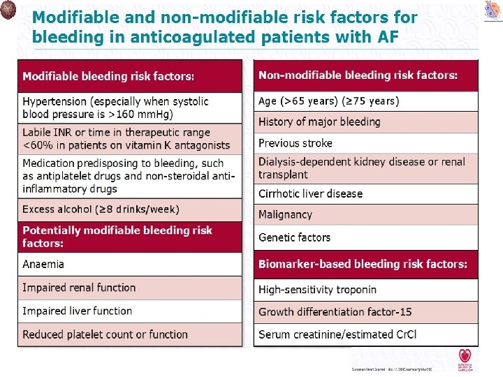 Valutare il rischio tromboembolico ed emorragico • I pazienti con stenosi mitralica e quelli con protesi valvolare meccanica (FA valvolare) sono per definizione ad elevato rischio tromboembolico e devono essere anticoagulati con gli antagonisti della vitamina K (AVK), monitorando l’INR che deve essere mantenuto fra 2 e 3 (2. 5 -3. 5 nelle protesi valvolari meccaniche) • Nei pazienti con FANV la stratificazione del rischio trombotico/emorragico è Bleeding Risk Stratification: The HAS-BLED score obbligatoria L’ HAS-BLED score deve essere utilizzato per individuare e cercare di rimuovere, possibilmente, le cause che aumentano il rischio emorragico e non per ecludere il paziente dal trattamento anticoagulante Il rischio trombotico ha un peso maggiore del rischio emorragico, è significativo per valori di CHA 2 DS 2 -VASc ≥ 1 (≥ 2 nelle donne) Le condizioni che incidono sul rischio trombotico spesso sono le stesse che influenzano il rischio emorragico