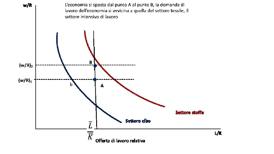 a b 1 2 1) L’aumento del prezzo relativo della stoffa sposta il pattern di produzione verso la stoffa (A B parte b) 2) Poiché la stoffa è il settore labour-intensive, la domanda di lavoro relativa aumenta quando la produzione si sposta verso il settore della stoffa 3) Essendo invariata l’offerta relativa di lavoro, l’aumento della domanda relativa di lavoro determina un aumento del salario relativo (A B parte a) 4) L’aumento del salario relativo comporta una riduzione del rapporto L/K in entrambi i settori (punti 1 e 2 parte a) 5) La domanda relativa di lavoro si avvicina al quella del settore labour intensive