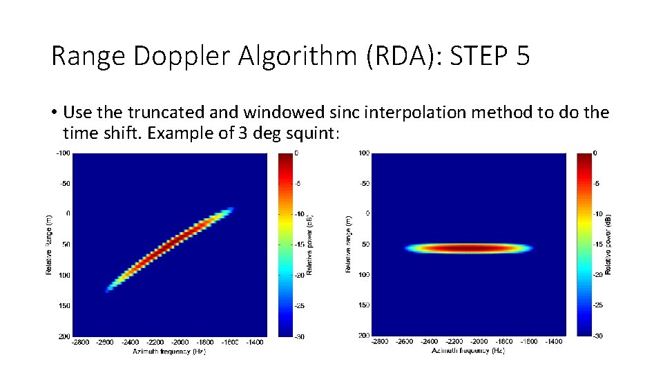 Range Doppler Algorithm (RDA): STEP 5 • Use the truncated and windowed sinc interpolation method to do the time shift. Example of 10 deg squint: