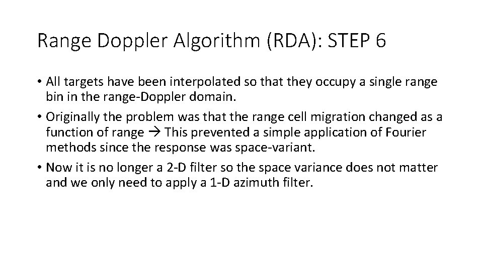 Range Doppler Algorithm (RDA): STEP 6 • All targets have been interpolated so that they occupy a single range bin in the range-Doppler domain. • Originally the problem was that the range cell migration changed as a function of range This prevented a simple application of Fourier methods since the response was space-variant. • Now it is no longer a 2 -D filter so the space variance does not matter and we only need to apply a 1 -D azimuth filter.