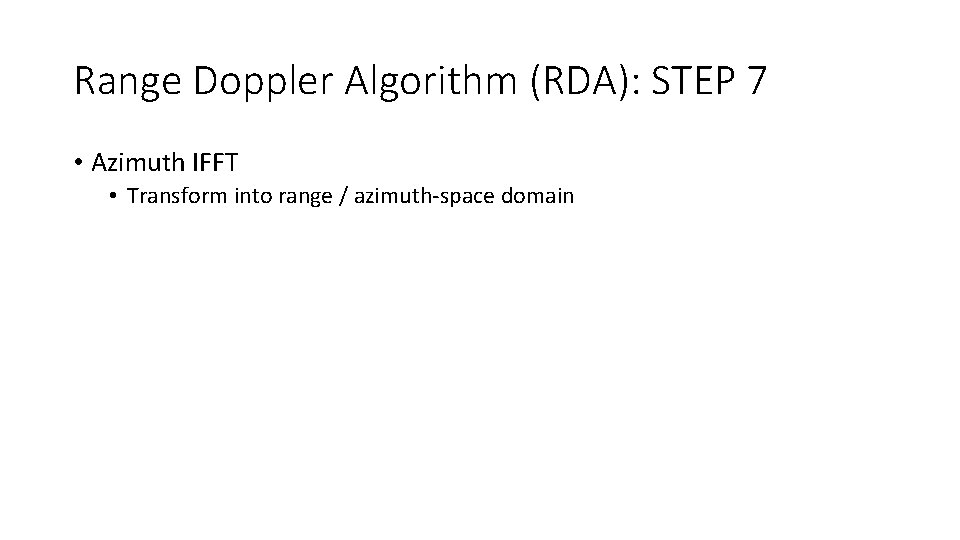 Range Doppler Algorithm (RDA): STEP 7 • Azimuth IFFT • Transform into range / azimuth-space domain