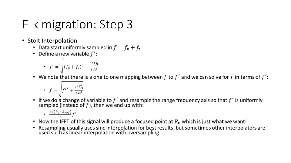 F-k migration: Step 1 • Two-dimensional FFT • Transform to range-frequency / wavenumber domain • (Wavenumber has a one to one mapping with Doppler domain)