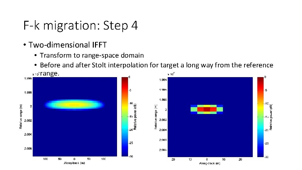 F-k migration: Step 4 • Two-dimensional IFFT • Transform to range-space domain • Before and after Stolt interpolation for target a long way from the reference range.