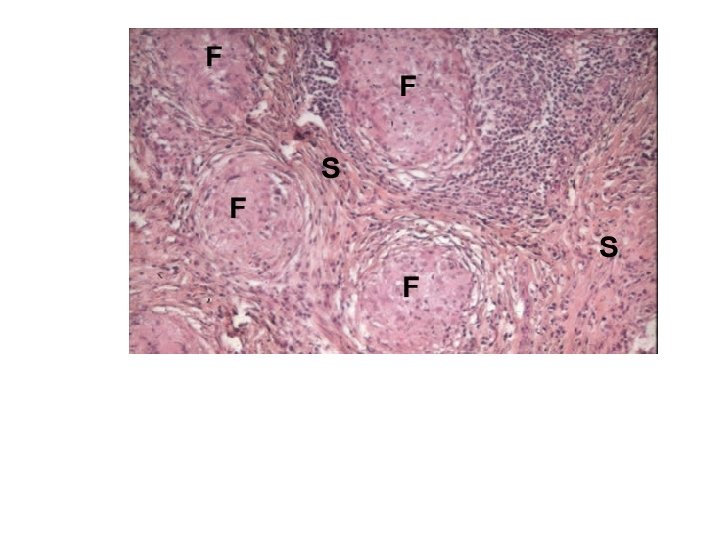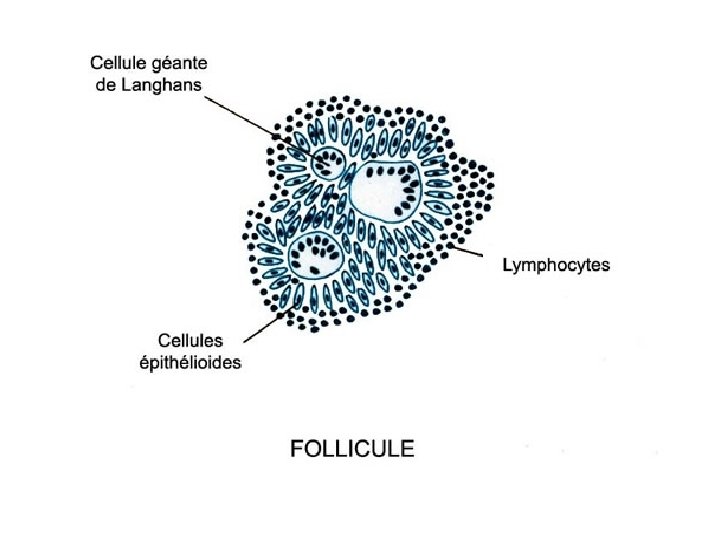 • Cellules épithélioides : composante majeure • Rares cellules géantes multi nucléés avec parfois inclusions intra cytoplasmiques ( corps de Schauman – corps astéroïdes ) • Couronne lymphocytaire • Fibrose périphérique • De la nécrose fibrinoide peut être retrouvée ( à ne pas confondre avec de la nécrose caséeuse ) -Les follicules sont de même taille non confluant