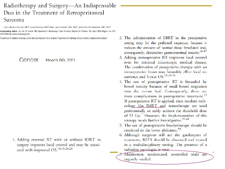 On retiendra n n n Pathologie rare Chirurgie multi site et multidisciplinaire Nécessite d’une concertation en rcp avant la chirurgie Avis de centre expert avant résection Place de la radiothérapie (essais++)