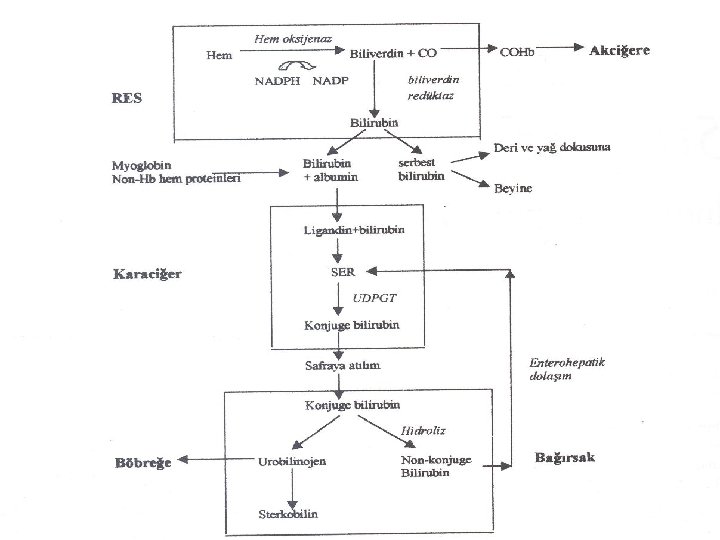 Bilirubin metabolizması n n Bilirubinin oluşumu Dolaşımda taşınması Karaciğere alınması ve konjugasyonu Bilirubinin safraya atılması ve enterohepatik dolaşım