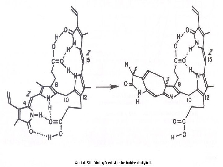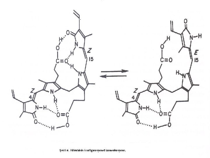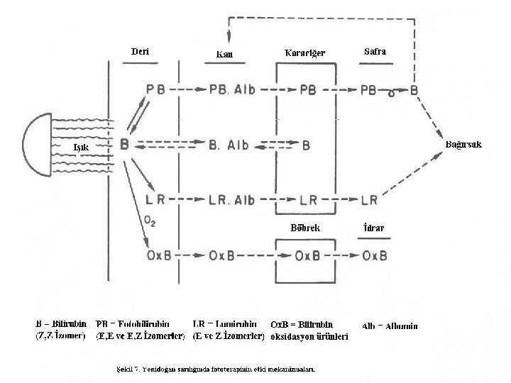n n n Geometrik izomerizasyonla E izomerleri oluşur. Bunlar fotokimyasal olarak reversibldır ve birbirine dönüşebilir. Çözünürlükleri çok fazladır. Suda erir olan bu izomerler KC’e oradanda safraya taşınır. Bilirubinin FT ile eliminasyonunun %80’i bu yolla olur. Yapısal izomerizasyonla lumirubin oluşur. Lumiribinin oluşumu irreversibldır. Uzun süreli FT’de esas atılma yolu lumirubin ile olur. Fotooksidasyon invitro ortamda oldukça etkili olmasına rağmen sarılıklı yenidoğanlarda etkisi azdır.
