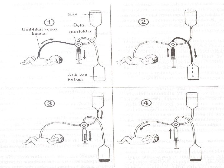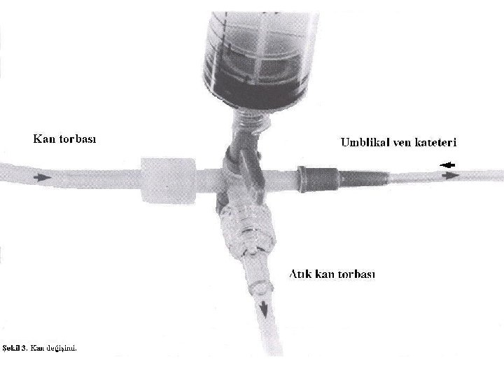 Kan değişimi tekniği n n n Göbek venine sokulan 5 veya 8 Fr göbek kateteriyle yapılır. Göbek kateteri ksifoid ile göbek arası mesafe kadar itilir. Daha sonra çekme-verme (pull-push) metoduyla bir şırınga ve musluk yardımıyla işlem tek kişi tarafından yapılabilir Kan değişimi için kullanılacak kan taze (< 72 saat) ve bebeğin kanıyla uygunluğu (cross-match) test edilmiş olmalıdır. Işınlanmış kan tercih edilmelidir.