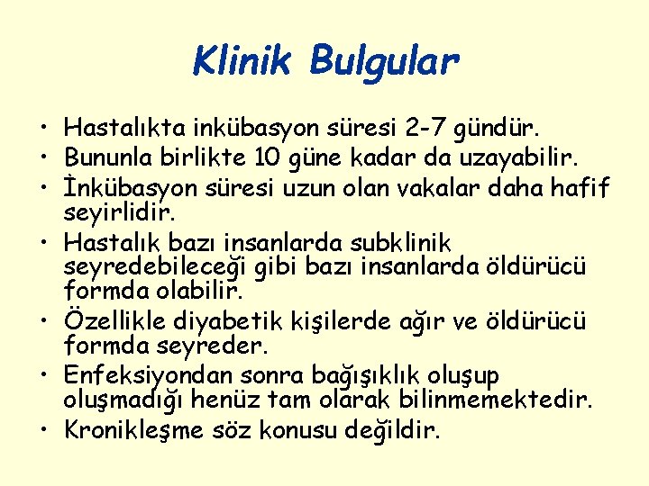 Klinik Bulgular • Hastalıkta inkübasyon süresi 2 -7 gündür. • Bununla birlikte 10 güne kadar da uzayabilir. • İnkübasyon süresi uzun olan vakalar daha hafif seyirlidir. • Hastalık bazı insanlarda subklinik seyredebileceği gibi bazı insanlarda öldürücü formda olabilir. • Özellikle diyabetik kişilerde ağır ve öldürücü formda seyreder. • Enfeksiyondan sonra bağışıklık oluşup oluşmadığı henüz tam olarak bilinmemektedir. • Kronikleşme söz konusu değildir.