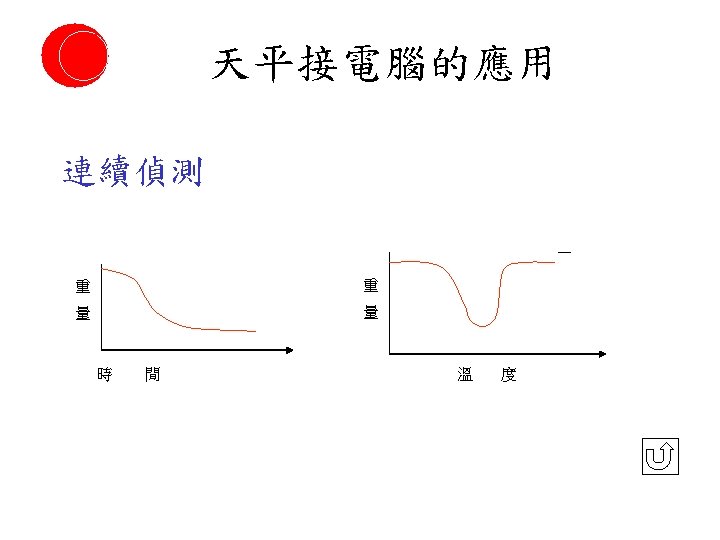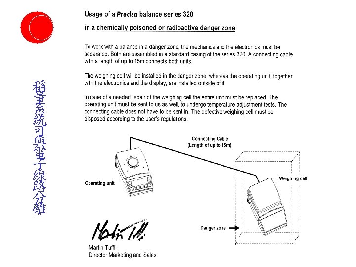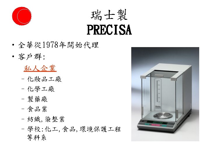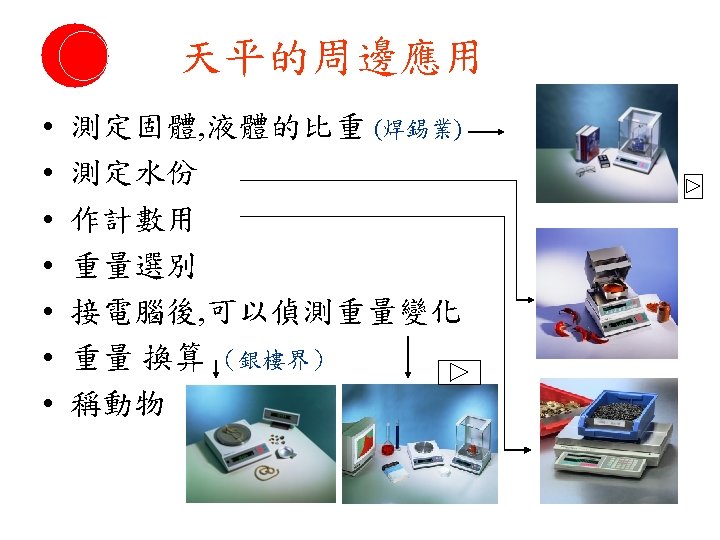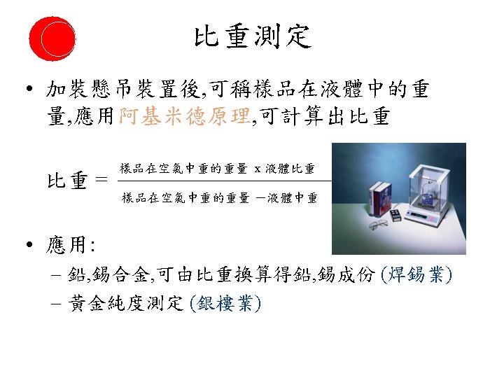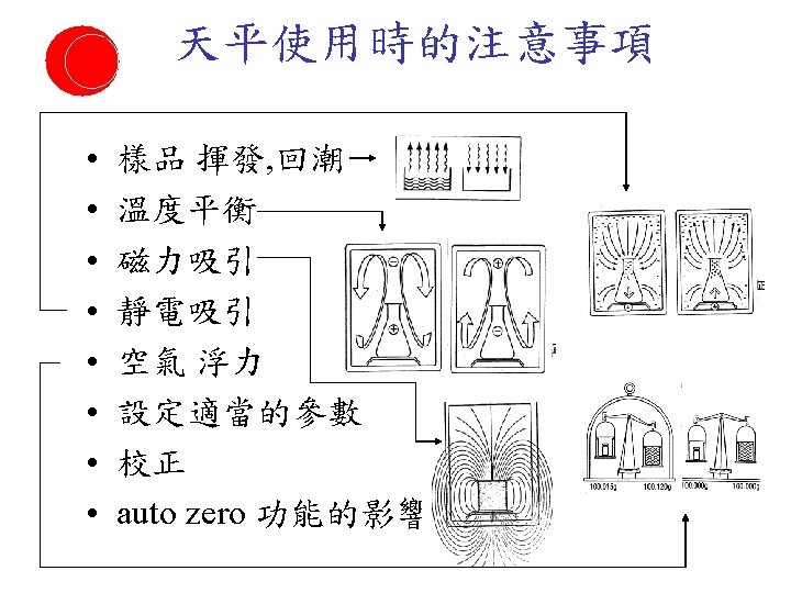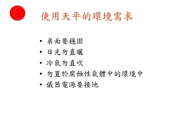 天平的規格及常用術語 0 g 404 g Weighing range (最大稱量 ) 404 g 0 g 102 g Fine range (精密範圍) 102 g Floating range (精密範圍這一段可移動) 102 g Readability (最小可讀值) 0. 1 mg Dual range (兩種稱量範圍) 0. 1 mg/1 mg Taring range (可扣重範圍) 404 g Reproducibility (再現性) 0. 03 mg Linearity (線性) +/- 0. 1 mg Response time (反應時間) 5 s Floating display (顯示器更新數值的間隔時間) 0. 04/0. 08/0. 16/0. 32 s Integration time (內部運算時間) optimized automatically Stability (定義穩定窗) adjustable in 3 steps Sensitivity drift (溫度漂移) +/- 2 x 10 -6 SCS Self Calibration System (內藏砝碼, 自我校正系統) Draft shield Wind shield(防風罩)