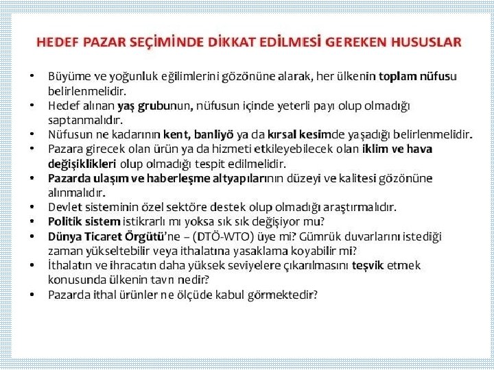 Global Pazarlamayı Hızlandıran Başlıca Unsurlar • Sosyal yaşamda, teknolojide ve ekonomide yaşanan globalizm • Internet ve yeni teknolojiler • Entelektüel sermaye • Para piyasalarında yaşanan hareketlilik ve entegrasyon olarak sıralanmaktadır. • Ulusal sınırların bir varoluş nedeni olmasının ve yaptırımının zayıflaması
