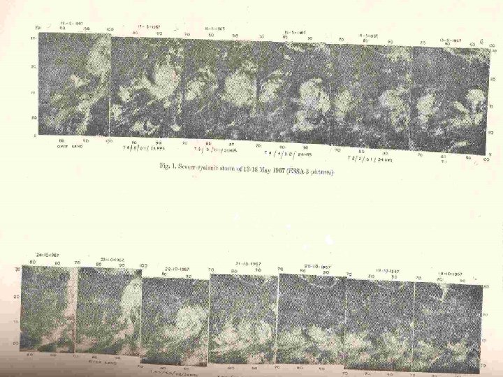 Earliest Satellite Records v By using this technique, post-mortem studies were done for the cyclones for the period 1967 -1971 by using pictures from the satellites ESSA-3, ESSA-9, ITOS-1 And NIMBUS-3 (D. K. Mishra, Hemraj, 1974) v. Conclusions from these studies were quite different than those by Dvorak. It may be because of lack of measurement techniques.