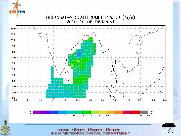 Parameter Oceansat-II Quik. SCAT Frequency 13. 515 GHz 13. 4 GHz Wind speed range 4 to 24 m/s 3 to 20 m/s Wind speed Accuracy Better than 20% (RMS) 2 m/s Wind direction Accuracy 20º (RMS) 20º Resolution 50 X 50 km 25 km Swath 1820 km 1800 km