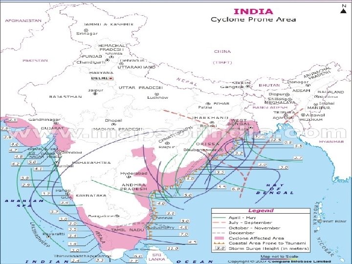 SOME FACTS ABOUT CYCLONES (Cont’d) v Most vulnerable coast in the West Coast - South Gujarat coast. v Most vulnerable coast in the East Coast - 24 paraganas of West Bengal followed by Krishna & Nellore districts of AP. v Life period of a Tropical Cyclone is 5 -6 days. It will have hurricane intensity for 2 -4 days as against 6 days of global average. v Life period of the longest lived Tropical Cyclone in Indian seas is 14 days (2 -15 th Nov, 1886 & 16 -29 th Nov, 1964). v Life period of the longest lived Hurricane Ginger over Atlantic is 31 days during 1972. v Size of a Tropical Cyclone over Indian seas is 50 -100 km radius to 2000 km radius with average of 3º to 5º (300 – 600 km).
