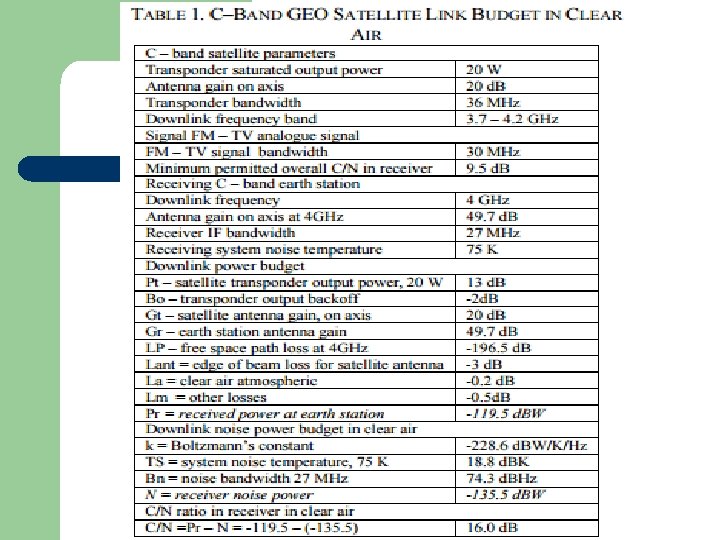 Link Design Procedure l 1. 2. 3. The design procedure for a one-way satellite communication link can be summarized by the following 10 steps. The return link design follows the same procedure. Determine the frequency band in which the system must operate. Determine the communications parameters of the satellite. Determine the parameters of the transmitting and receiving earth stations.