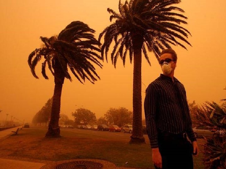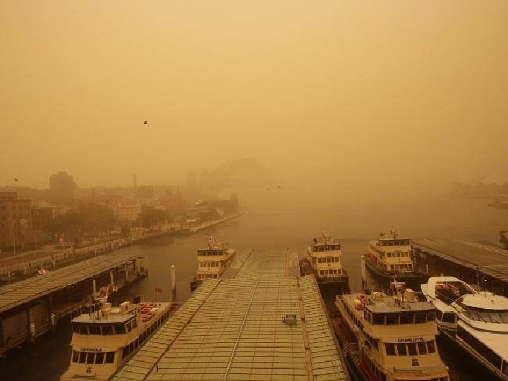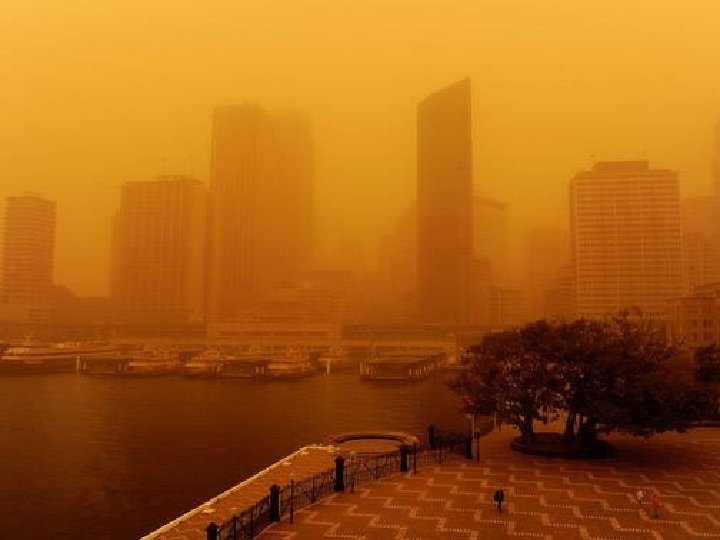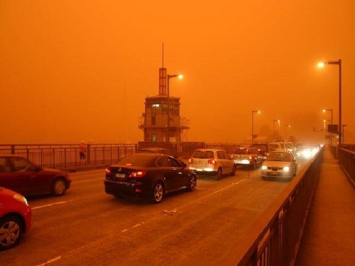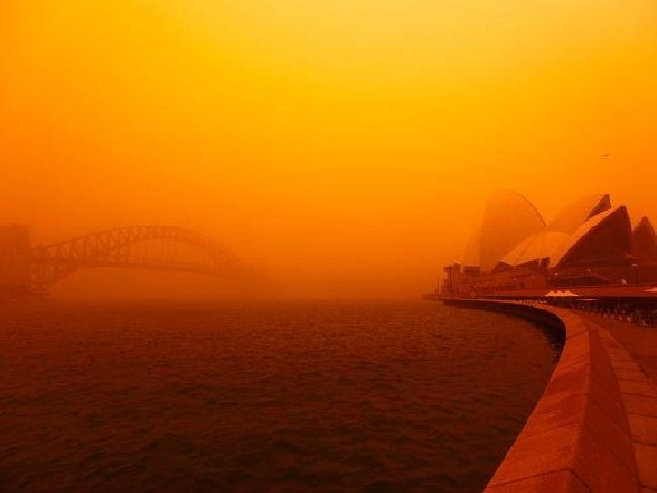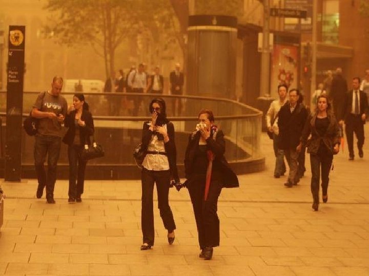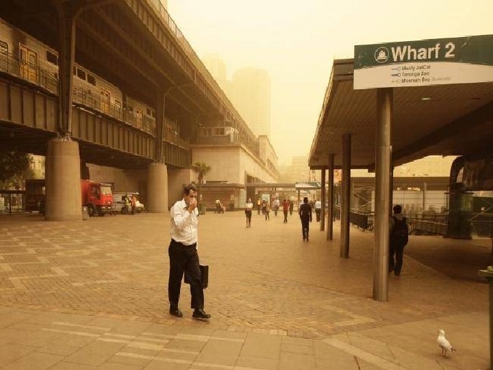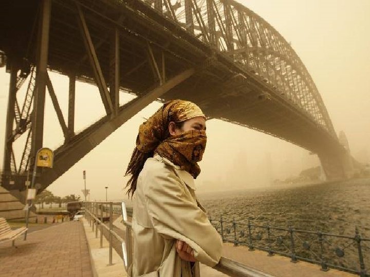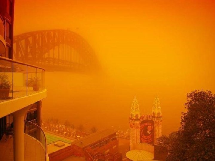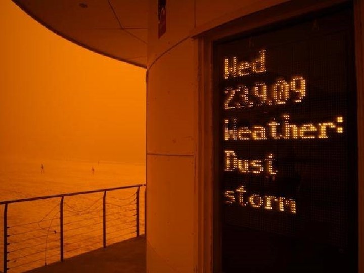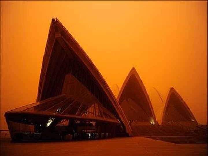 Satellite photo Desert dust storm chokes Sydney Wednesday, 23 September 2009 http: //news. bbc. co. uk/2/hi/8270104. stm http: //www. dailytelegraph. com. au/news/gallery-e 6 frewxi-1225778417848? page=44 A large stretch of Australia’s east coast, including the largest city Sydney, has been shrouded in red dust blown in from the desert outback. Visibility in Sydney was so bad that flights were diverted and harbour ferry traffic disrupted. Landmarks such as the opera house were obscured, and many residents took to wearing masks. Emergency services reported a surge in calls from people with breathing problems. Dust storms are common in the arid "red centre" of Australia, but they rarely reach the populated coastal regions. The storm crippled the transportation system, with long delays to flights and bumper-to-bumper traffic on major roads. Children, the elderly and people with respiratory problems were told to stay indoors until the dust had cleared later on Wednesday. It was blown out to sea and up the coast by the strong winds.