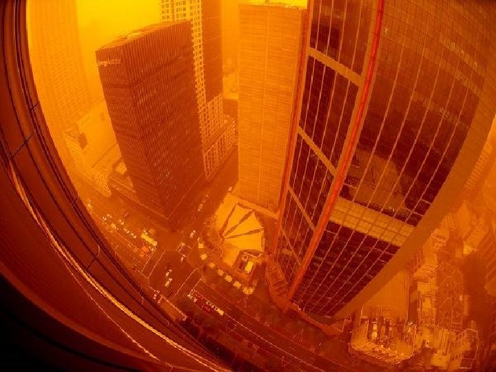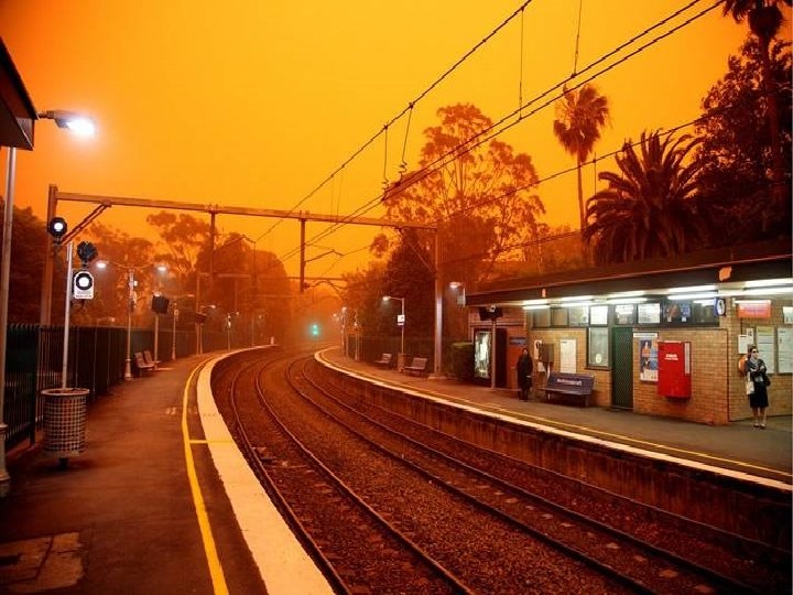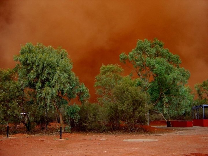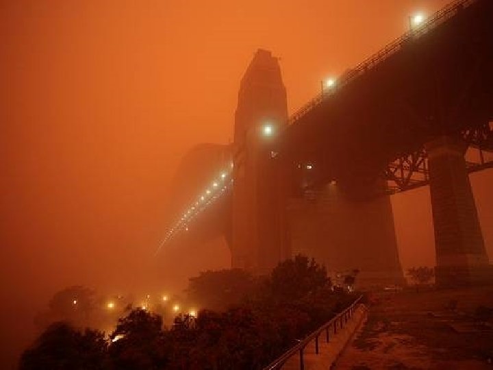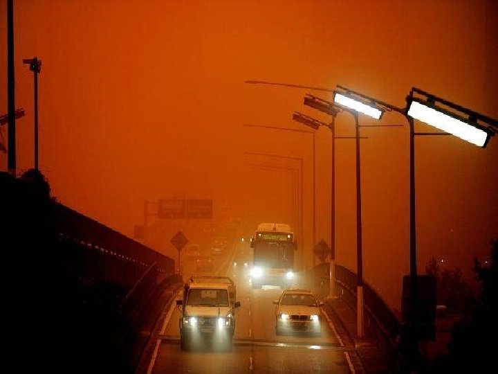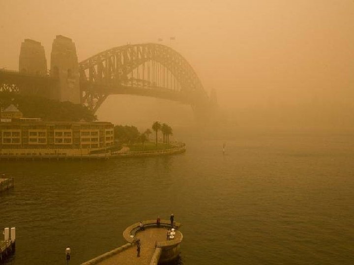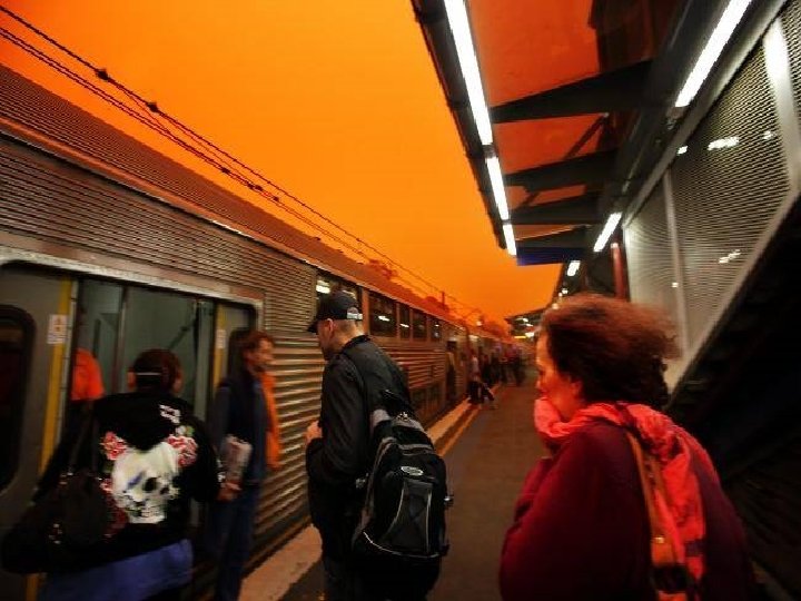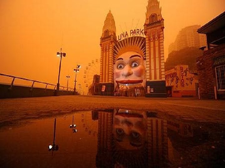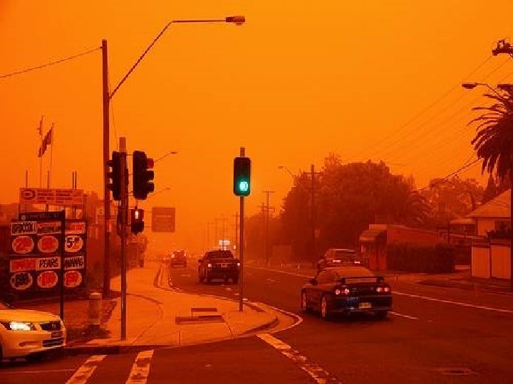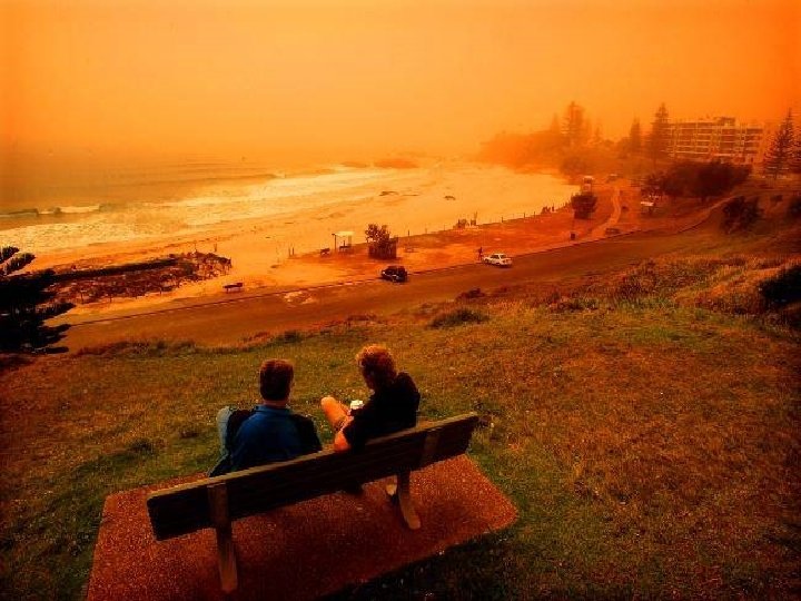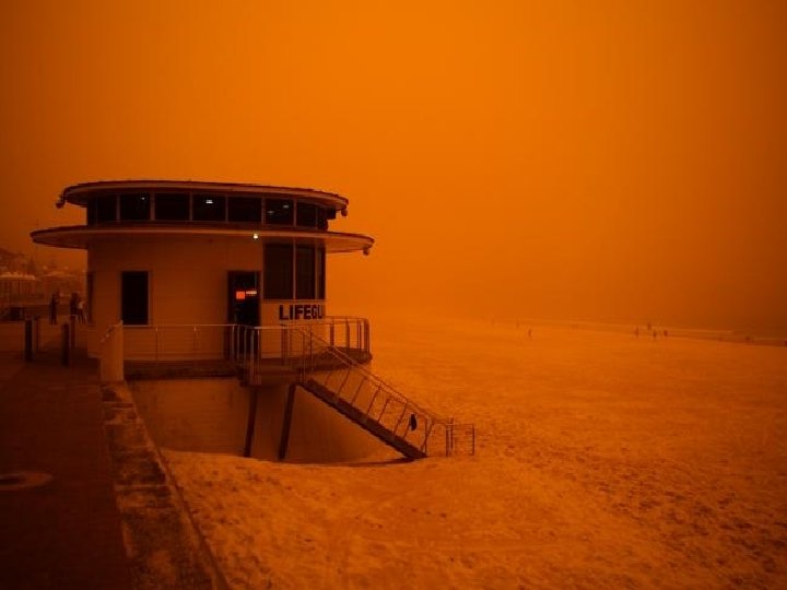 Satellite photo Desert dust storm chokes Sydney Wednesday, 23 September 2009 http: //news. bbc. co. uk/2/hi/8270104. stm http: //www. dailytelegraph. com. au/news/gallery-e 6 frewxi-1225778417848? page=44 A large stretch of Australia’s east coast, including the largest city Sydney, has been shrouded in red dust blown in from the desert outback. Visibility in Sydney was so bad that flights were diverted and harbour ferry traffic disrupted. Landmarks such as the opera house were obscured, and many residents took to wearing masks. Emergency services reported a surge in calls from people with breathing problems. Dust storms are common in the arid "red centre" of Australia, but they rarely reach the populated coastal regions. The storm crippled the transportation system, with long delays to flights and bumper-to-bumper traffic on major roads. Children, the elderly and people with respiratory problems were told to stay indoors until the dust had cleared later on Wednesday. It was blown out to sea and up the coast by the strong winds.
