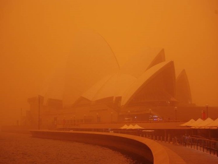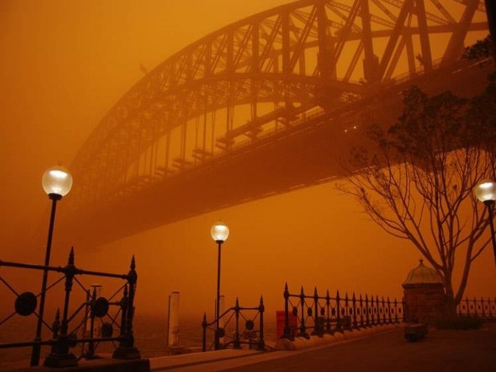 Before Sydney Dust Storm, 23 September 2009, Sydney, Australia was overtaken by it’s worst dust storm in years, overtaking the city’s monuments and sinking deep within its buildings and underground railroad. The dust produced an alien orange hue to the sky, reminiscent of the skies of Mars. The storm drove photographers into the streets to capture the once-in-alifetime event, when the largest city in Australia was overcome by a palpable dust that blotted out the sun. During Dust Storm
