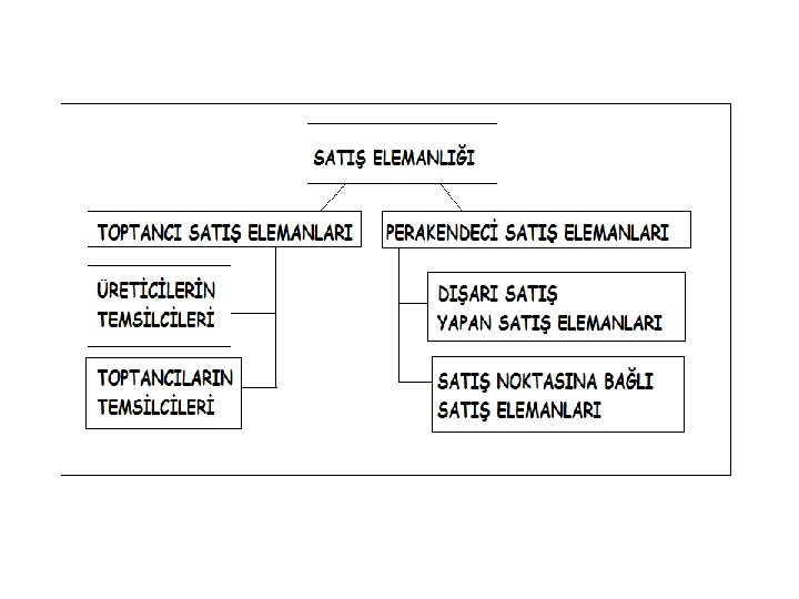 • • Esas itibariyle mal teslimi yapan satış elemanı : Meşrubat , benzin ve benzeri malların dışında teslim işini yapar. Satış hükümlülüğü yoktur; olsa da, ikinci derecede olup yeni satış yaratması pek söz konusu olmaz. Ama müşteriye iyi hizmet ve has davranış daha çok satışa yol açar. Tezgahta satış elemanı : İçeride tezgah arkasında , çoğu kez neyi alacağına karar vermiş olan müşteriye istediklerini verir. Dışarıda sipariş alan satış elemanı : Görevi dışarıda sipariş almak olan perakende satış mağazalarıyla ilişki kuran satış elemanıdır. Yaratıcı satışçılık yanı azdır. Misyoner satış elemanı : Sipariş olmadan mevcut ve potansiyel alıcılara iyi niyet ziyareti yaparak bilgi veren satış elemanıdır. İşletmeye karşı olumlu ve iyi duygular yönetme amacı güder. İlaç fabrikasında “özel görevle” görevlendirilen bir doktor gibi. Teknik danışman satış elemanı : Teknik bilginin çok önem kazandığı durumda görülen satış elemanı tipidir. Teknik eğitim görmüş, satış mühendisi denilen elemanlarca satış işi yapılır. Fiziksel mallarda yaratıcı satış elemanı : Buzdolabı, çamaşır makinesi, ansiklopedi gibi somut mallarda talebi teşvik ederek, talep yaratarak satış yapan satış elemanıdır. Hizmet satışı yapan yaratıcı satış elemanı : Eğitim , sigorta ve reklam hizmetleri gibi soyut malların satışını yapar Fiziksel (somut) mallara göre bu tür malların faydalarını ortaya koymak daha güç olduğundan satışı da çok daha güçtür.