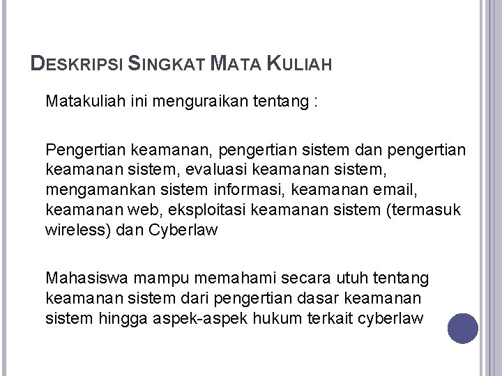 DESKRIPSI SINGKAT MATA KULIAH Matakuliah ini menguraikan tentang : Pengertian keamanan, pengertian sistem dan pengertian keamanan sistem, evaluasi keamanan sistem, mengamankan sistem informasi, keamanan email, keamanan web, eksploitasi keamanan sistem (termasuk wireless) dan Cyberlaw Mahasiswa mampu memahami secara utuh tentang keamanan sistem dari pengertian dasar keamanan sistem hingga aspek-aspek hukum terkait cyberlaw
