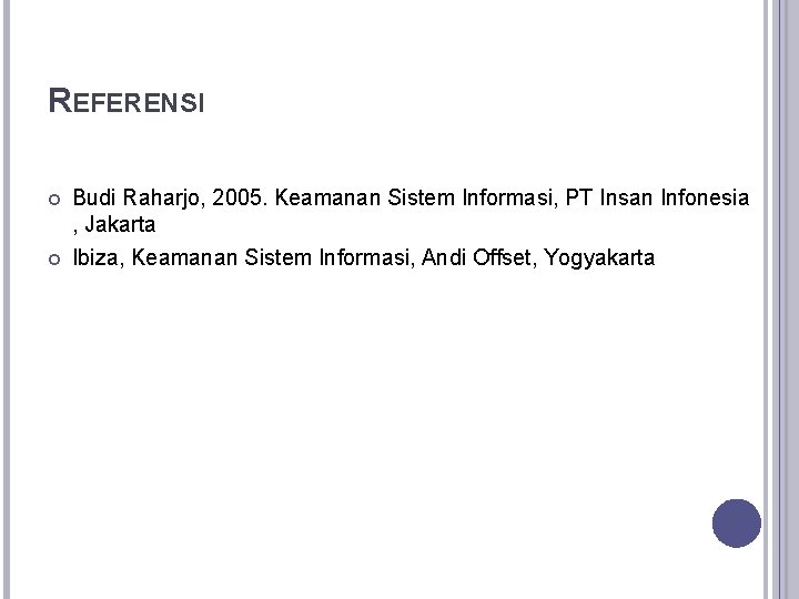 REFERENSI Budi Raharjo, 2005. Keamanan Sistem Informasi, PT Insan Infonesia , Jakarta Ibiza, Keamanan Sistem Informasi, Andi Offset, Yogyakarta