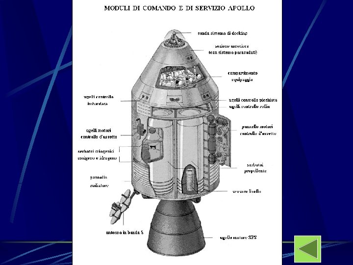 STADI Il primo stadio S-IC fu costruito dalla Boeing Company. Come per quasi ogni stadio del razzo, la maggior parte della massa (che al lancio era di oltre 2000 tonnellate) era costituita dal combustibile e dal comburente. Nel caso del primo stadio il combustibile era un tipo di kerosene denominato RP-1 che veniva miscelato durante la combustione con ossigeno liquido. Era alto 42 metri, largo 10 (di diametro), e capace di produrre una spinta di 33, 4 MN per portare il razzo a una quota di 61 km. I cinque motori F-1 sono stati organizzati in un modello a croce. Il motore centrale era fisso, mentre i quattro sull'anello esterno potevano girare idraulicamente per controllare la direzione del razzo.