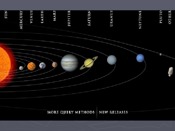 ► Planetos skirstomos į dvi pagrindines grupes. Pirmąją grupę sudaro netoli saulės skriejančios 4 planetos - Merkurijus, Venera, Žemė ir Marsas. Šios planetos turi daug bendrų bruožų. Jos visos turi kietą paviršių, sudarytos iš panašių medžiagų. Antrąją gupę sudaro penkios didžiosios planetos Jupiteris, Saturnas, Uranas, Neptūnas ir Plutonas. Jos labai skiriasi nuo Žemės grupės planetų. Jos sudarytos iš dujų.
