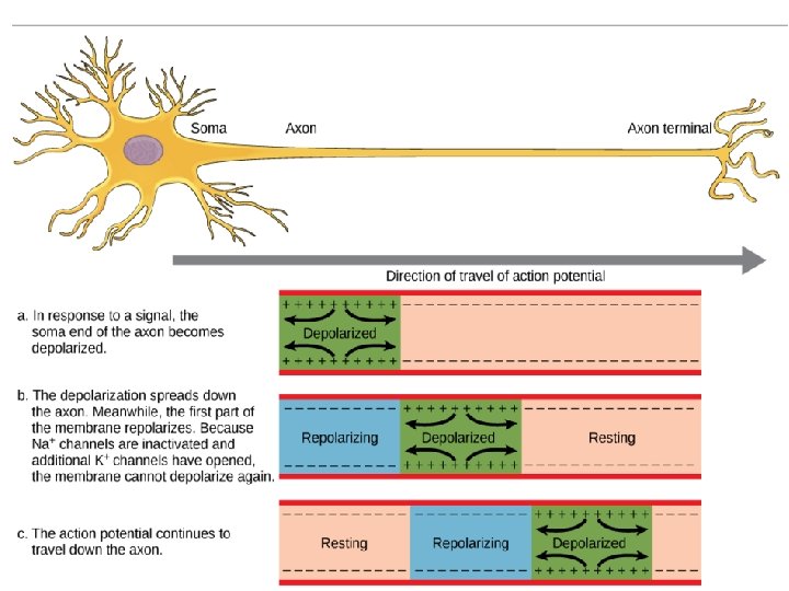 How does each segment of the neuron go back to “resting potential”? • Once the action potential passes, Na+ channels close, and K+ channels open. • K+ slowly moves out of the cell to restore the negative charge inside of the neuron. • Movement of Na+ out, and K+ in causes section of axon to revert back to resting potential (negative inside, positive outside).