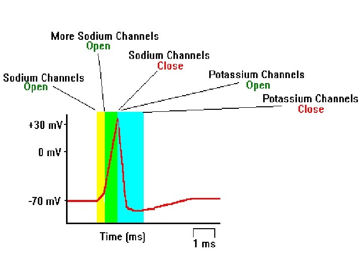 Steps of Action Potential Moving Down a Neuron 1) The axon membrane is at a resting potential of 70 m. V, and then rises to the threshold potential of 50 m. V, either due to a stimulus, or the binding of a neurotransmitter at a synapse. 2) Them membrane depolarizes due to voltage-gated Na+ channels opening and Na+ rapidly moving in. 3) The membrane repolarizes due to voltage-gated K+ channels opening and K+ slowly moving out. 4) The membrane returns to the resting potential due to the eventual movement of Na+ back out, and K+ back into the cell.