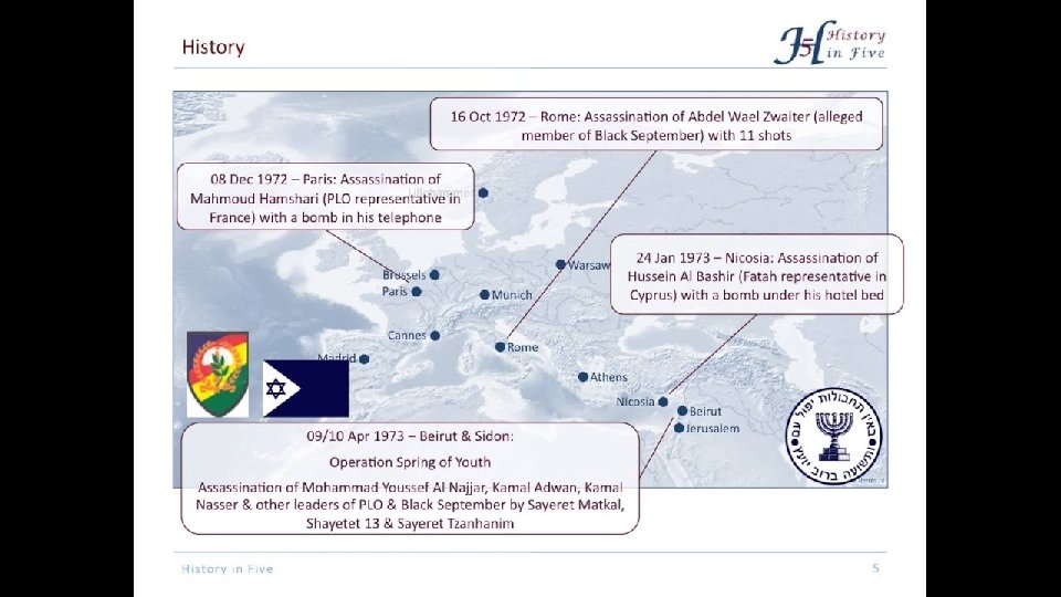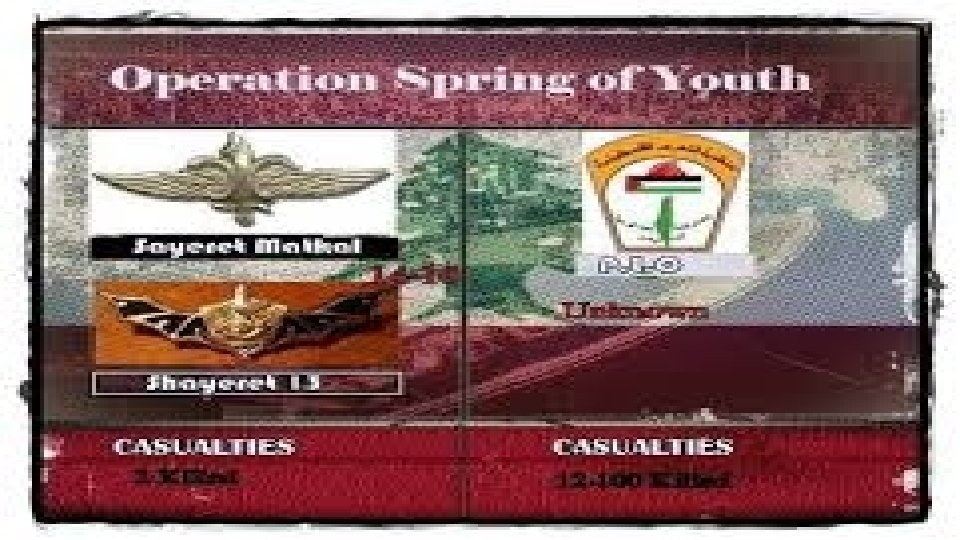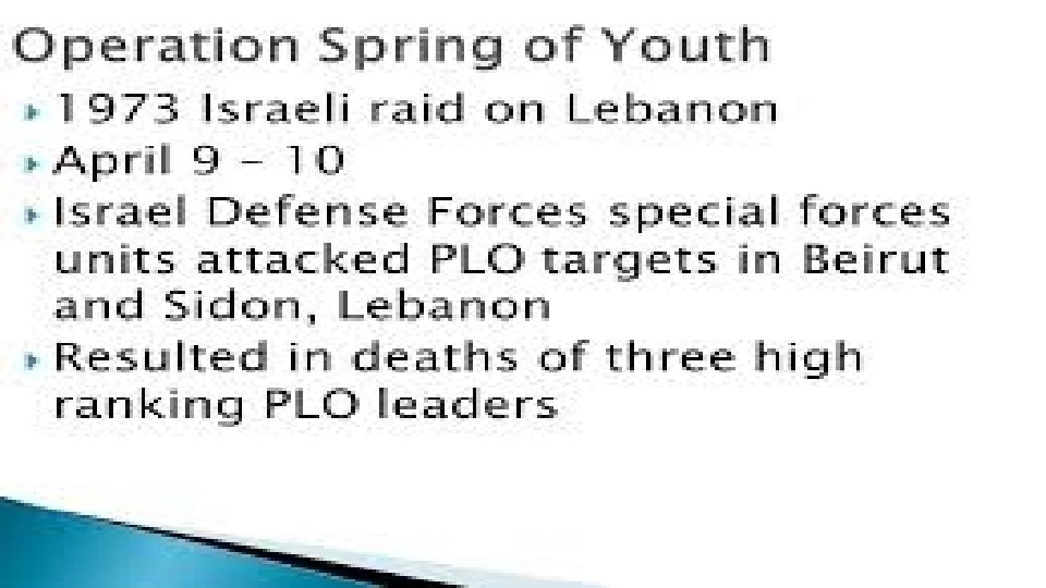 Operation Spring Of Youth • Prime Minister Golda Meir approved Operation Wrath of God in response to the assassination of Israeli Olympic athletes by Palestinian terrorists in 1972. • One of the critical missions associated with the response is Operation Spring of Youth. • The critical and sensitive operation occurred in Lebanon.