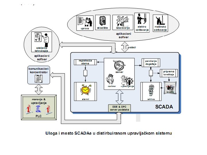 Kod SCADA sistema funkcija upravljanja se deli na: • lokalno upravljanje i • daljinsko upravljanje. SOFTVERSKA PODRŠKA SCADA SISTEMA Softverski proizvodi se koriste u okviru sledećih komponenti SCADA sistema: • Operativni sistem centralnog kompjutera: softver koji se koristi za upravljanje hardverom centralnog kompjutera. Softver može da se bazira na UNIX, Windows ili drugim popularnim operativnim sistemima. • Operativni sistem operaterskog terminala: softver koji je obično isti kao operativni sistem centralnog kompjutera. Ovaj softver zajedno sa softverom centralnog kompjutera obično doprinosi umrežavanju centralnog kompjutera i operaterskih terminala. • Aplikacija centralnog kompjutera: softver koji upravlja razmenom podataka između PLC-ova i centralnog kompjutera. Softver takođe omogućava grafički korisnički interfejs (GUI 22) koji nudi mimik ekrane pojedinačnih delova procesa (ili celog proces), ekrane alarma, grafike koji predstavljaju promenu analognih parametara procesa (trends) i ekrane upravljačkih funkcija.