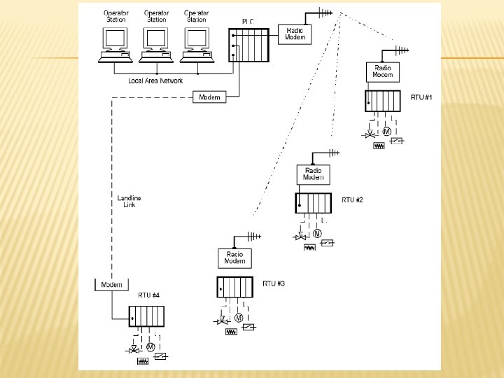 � The master station has the following typical functions: � Establishment of communications • Configure each RTU � • Initialize each RTU with input/output parameters � • Download control and data acquisition programs to the RTU � � Operation of the communications link • If a master slave arrangement, poll each RTU for data and write to RTU � • Log alarms and events to hard disk (and operator display if necessary) � • Link inputs and outputs at different RTUs automatically � � Diagnostics • Provide accurate diagnostic information on failure of RTU and possible problems � • Predict potential problems such as data overloads �