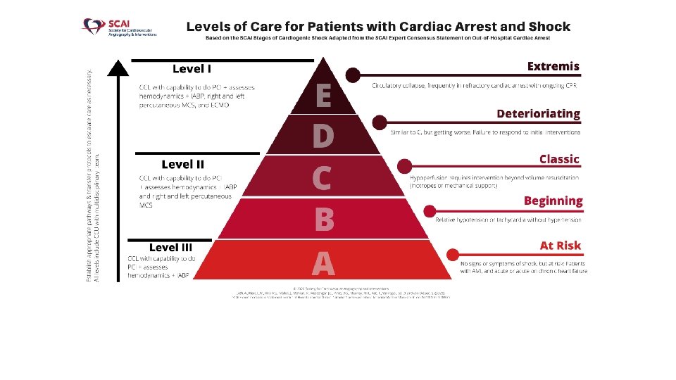Risk Scores Study Cohort Cardiac Arrest Hospital Prognosis (CAHP) 1410 patients 41% with post ROSC STEMI of ECG 69% male q q q q CREST Model 638 patients derivation 318 patients Validation No patients with STEMI 18. 9% recognized identified as circulatory cause of death q 122 patients derivation 344 patients validation q History of coronary artery disease q Glucose ≥ 200 mg/d. L q Non shockable rhythm q Age > 45 q p. H (arterial) ≤ 7. 0 C-GRAp. H Variables to assist decision making in a time sensitive situation q q Outcomes Age as continuous variable Non shockable rhythm Time from collapse to BLS Time from BLS to ROSC Location of cardiac arrest Epinephrine dose Arterial p. H CAHP < 150 86% had early invasive strategy 61% discharged alive from hospital with 95% with CPC score 1 or 2 CAHP 150 -200 66% had early invasive strategy 10% discharged alive from hospital with 88% with CPC score 1 or 2 CAHP > 200 47% had early invasive strategy 3% discharged alive from hospital with 86% with CPC score 1 or 2 History of coronary artery CREST score death due to shock disease 0 – 7. 1% Non shockable rhythm 1 – 9. 5% Ejection fraction < 30% at time 2 – 22. 5% of admission 3 – 32. 4% Shock at the time of admission 4 - 20% Ischemic time > 25 minutes 5 – 50% C-GRAp. H (0 -1) 70% with CPC score of 1 or 2 C-GRAp. H (4 -5) 98% with CPC score 3 to 5 Validation C-statistic reached 0. 93 (95% CI: 0. 91 to 0. 95) in the development cohort, and 0. 91 (95% CI: 0. 88 to 0. 93) in the prospective validation cohort Area under the curve (AUC) 0. 68 in the validation cohort AUC of 0. 814 in the validation cohort with a c-statistics of 0. 81