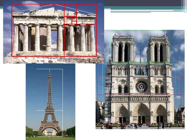 The Golden Mean • The Golden Mean – The most proportionately pleasing division of a line or form between 1/2 and 1/3. • The like is dividing the form so that the smaller portion has the same ratio to the larger as the larger has to the whole (example: 2/3=. 6 and 3/5=. 6) • This creates a series of ratios that progress by the sum of the two previous numbers (2: 3, 3: 5, 5: 8, 8: 13, 13: 21). • It can also be multiples of those ratios (2: 3 or 4: 6 or 6: 9, etc). • Square (2: 2) is the least pleasing shape or ratio. Rectangles are more pleasing, especially with a ratio of 2: 3. • Devised by the Greeks. 3 5 2 3 2