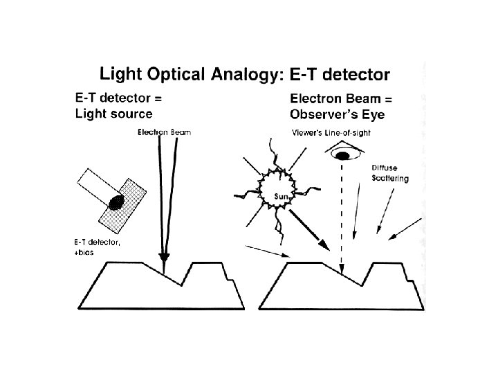 Topographic contrast Contributions: Direct BSE+SE SE distribution intensity I ~ sec Positive bias cage to accept secondary e- Variation in SE signal between two surfaces with different d. I = sec tan d So the contrast is given by d. I/I = tan d The SE are collected from most emitting surfaces since the positive bias allows SE to reach the detector Analogy to eye view
