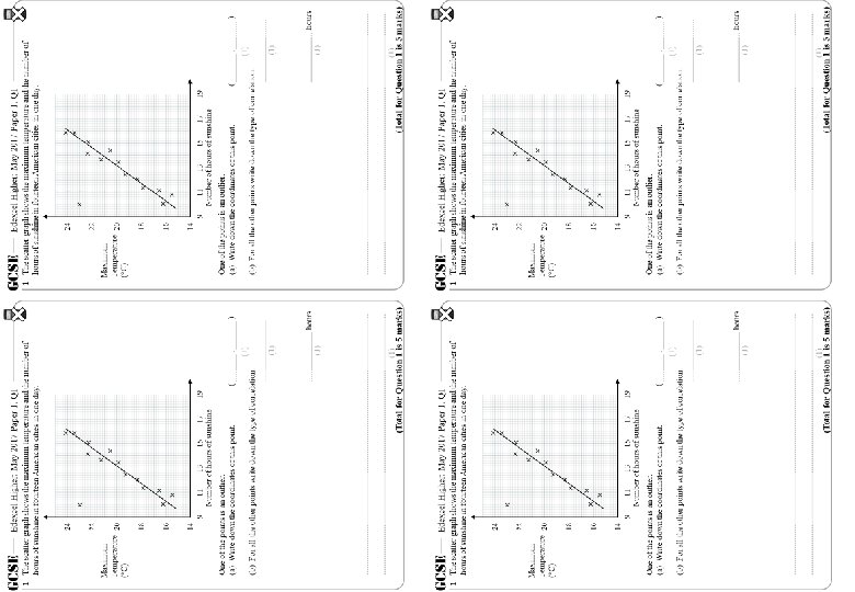GCSE Edexcel Higher: May 2017 Paper 1, Q 1 1 The scatter graph shows the maximum temperature and the number of hours of sunshine in fourteen American cities in one day. × × 24 × × × 22 × Maximum Temperature 20 (°C) 18 × 16 × × × × 14 9 11 13 15 17 Number of hours of sunshine One of the points is an outlier. (a) Write down the coordinates of this point. 19 ( 10 , 23 (b) For all the other points write down the type of correlation. ) (1) positive (1) On the same day, in another American city, the maximum temperature was 18. 6 °C. (c) Estimate the number of hours of sunshine in this city on this day. 12. 2 (1) hours Joan says, “Temperatures are lower on days when there is less sunshine. ” (d) Does the scatter graph support what Joan says? Give a reason for your answer. Yes, the majority of days with a lower temperature have less sunshine. (1) (Total for Question 1 is 5 marks)