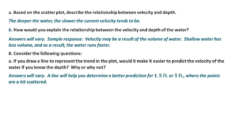 a. What can you tell about the relationship between the depth and velocity by looking at the numbers in the table? Answers will vary. According to the table, as the depth increases, the velocity appears to decrease. b. If you were to make a scatter plot of the data, which variable would you put on the horizontal axis, and why? Answers will vary. It might be easier to measure the depth and use that information to predict the velocity of the water, so the depth should go on the horizontal axis.