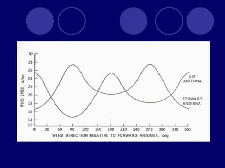 MODEL FUNCTIONS l Suppose SASS has only two observations, then we have two equations 1 o = 10 G(θ 1, 1, p 1) + 10 H(θ 1, 1, p 1). log(W) 2 o = 10 G(θ 2, 1+90, p 2)+10 H(θ 2, 1+90, p 2). log(W) There are two non linear Eqns in two unknowns W and 1. They can be solved by plotting W versus 1. The two eqns give two curves Since o is max. at up and downwind and minimum at cross winds, the curve has two maxima and two minima and they are separated by 90 The points where the curves intersect are the solutions (aliases) One of them represent the true wind To reduce the no. of aliases the next generation scatterometers had two additional antennas to reduce the no. of aliases
