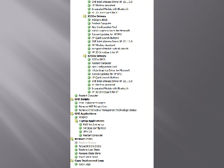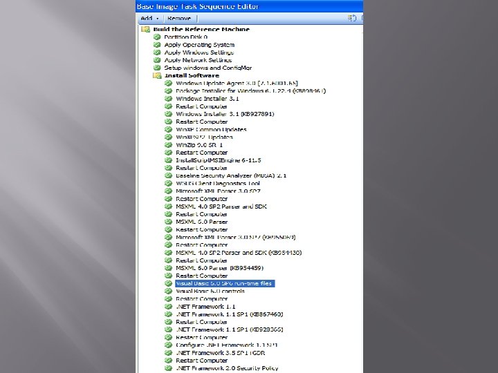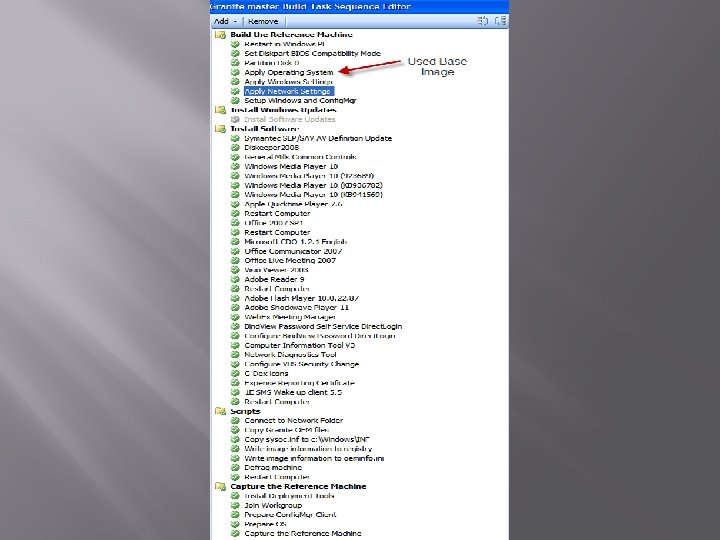 Things I’ve Learned along the way � WMI issue with server 2003 � Task seq will error when opening TS to edit due to many steps in TS Set WMI like server 2008 � Task seq is ran as system account not local admin � Anything applied against local admin profile will not take due to running as system account. � 90 sec delay between software install task seq � http: //support. microsoft. com/kb/955955