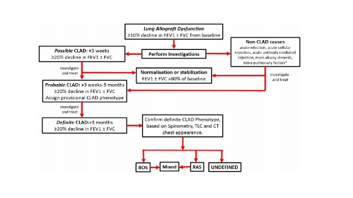 Stages of CLAD A patient attends a follow-up clinic 2 years after their double lung transplant. FEV 1 is 1. 4 L / FVC 2. 4 L (her reference post-transplant FEV 1/VC is 2. 0 L / 2. 5 L). She is investigated for rejection, infection, airway stenosis, and extra-pulmonary factors. No cause is found. There are no infiltrates seen on CT. Spirometry is repeated 4 weeks later and lung function is unchanged. Which of the following statements correctly describes her condition? 1. Does not meet the criteria for CLAD 2. Possible CLAD 3. Probable CLAD - OB phenotype 4. Probable CLAD - RAS phenotype 5. Definite CLAD - OB phenotype
