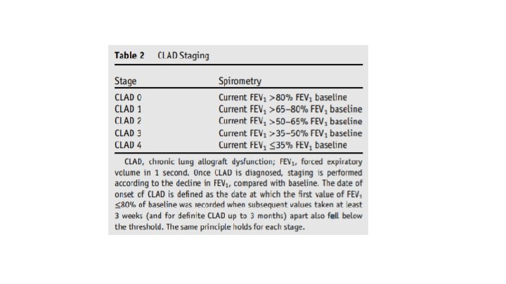 Stages of CLAD The same patient returns 3 months after their initial drop in lung function. Her Spirometry is static - FEV 1/VC 1. 4/2. 4 (baseline 2. 0/2. 5). CLAD is confirmed and the phenotype is OB. What stage of CLAD does she have? 1. CLAD 0 2. CLAD 1 3. CLAD 2 4. CLAD 3 5. CLAD 4