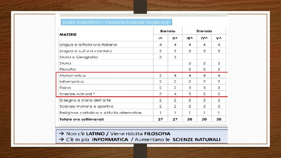 Scegliere l’opzione scienze applicate per • apprendere concetti, principi e teorie scientifiche anche attraverso esemplificazioni operative di laboratorio; • elaborare l’analisi critica dei fenomeni considerati, la riflessione metodologica sulle procedure sperimentali e la ricerca di strategie atte a favorire la scoperta scientifica; • analizzare le strutture logiche coinvolte ed i modelli utilizzati nella ricerca scientifica, sapendo applicare i metodi delle scienze in diversi ambiti; • individuare le caratteristiche e l’apporto dei vari linguaggi (storico-naturali, simbolici, matematici, logici, formali, artificiali); • comprendere il ruolo della tecnologia come mediazione fra scienza e vita quotidiana; • saper utilizzare gli strumenti informatici in relazione all’analisi dei dati e alla modellizzazione di specifici problemi scientifici e individuare la funzione dell’informatica nello sviluppo scientifico.